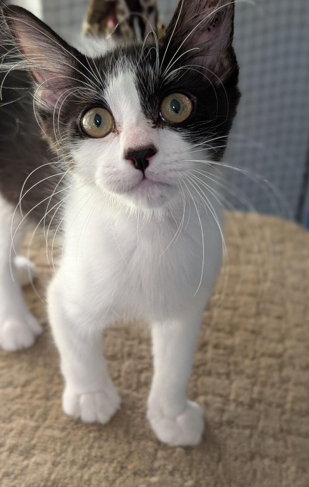 I have a sad back story because my mother was taken to the Pound when she was found in a barrel of oil. The day later she had our litter and we were brought up to the RSPCA. Our mother Elly was covered in oil and had ingested some so we were all oily little slugs and it wasn't certain if we would all survive. We went into foster care at 2 days old with our mother and now 14 weeks later we are big healthy kittens and the boys have had our vet work done, so I am available to find my forever home and hope that you like me. I am a very active kitten, liking a rough and tumble with my littermates and I am a speed freak and love to climb cat towers. I purr loudly and will lie on the couch with you but if I get too much handling I can be silly and nibble instead of licking, so know my limits until I mature a little more.