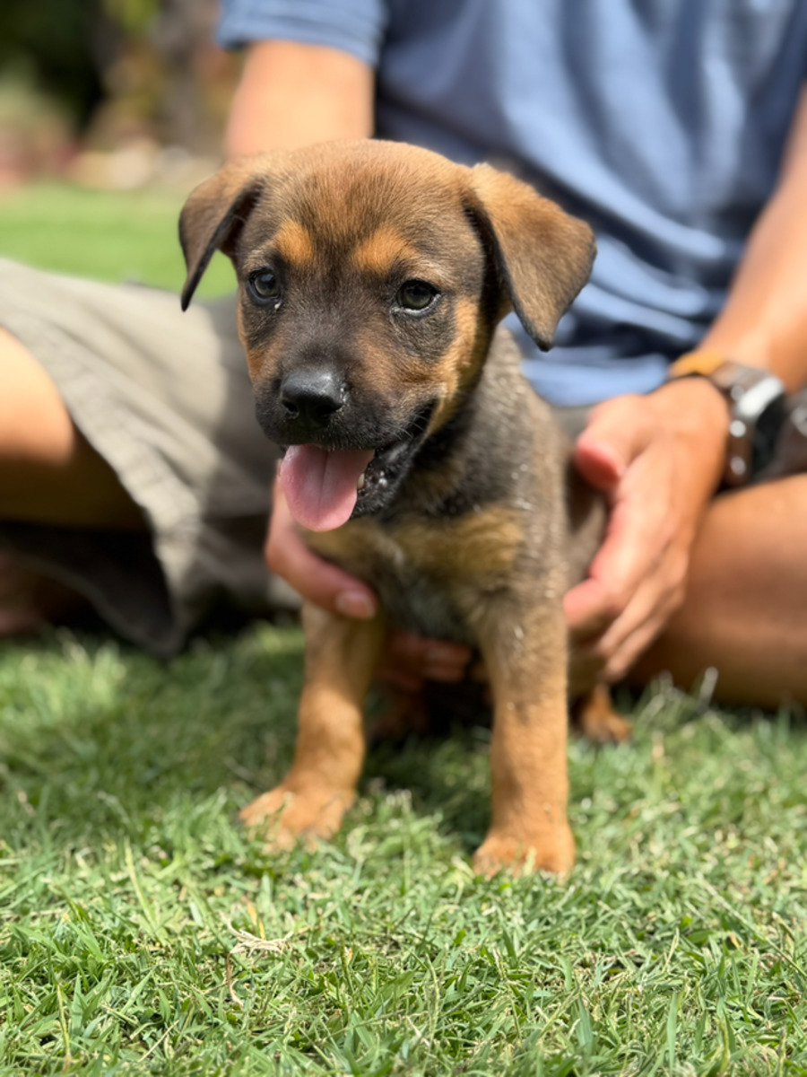 Chewy is a gorgeous little working-dog mix with a smoky brown coat and warm tan markings, a dark muzzle, and soft, floppy ears that frame his face perfectly (they may even perk up as he grows). His name is a nod to the Star Wars character — loyal, lovable, and full of quiet charm.