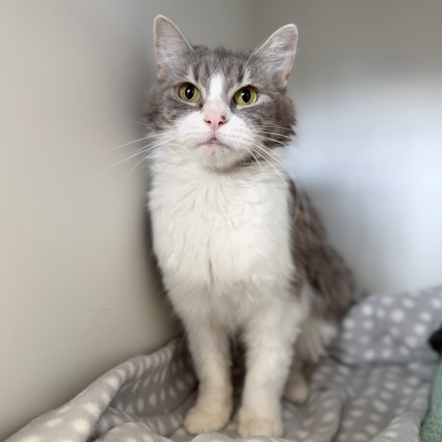 Julia is a beautiful 3-year-old grey and white Domestic Medium Hair with a gentle, endearing nature. She can be a little shy and unsure at first, but once she feels safe, her friendly personality shines through.
