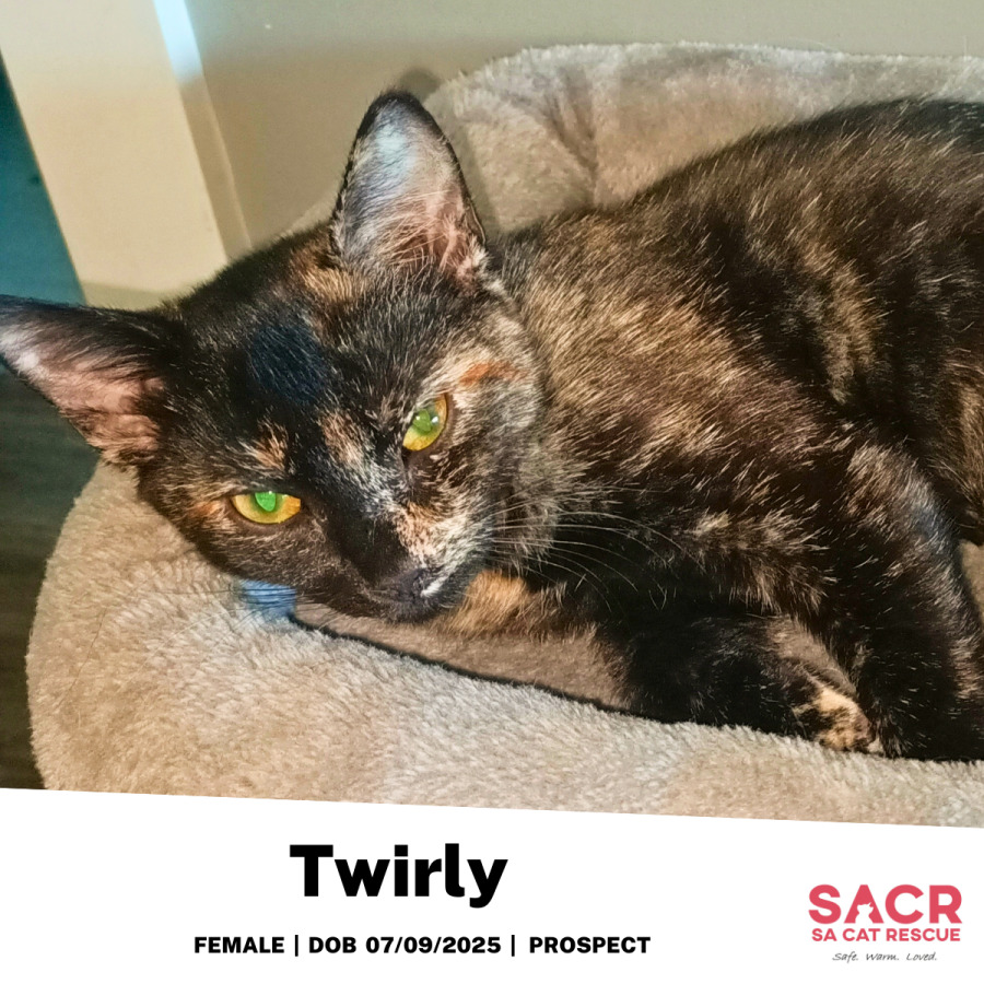 Twirly is a curious, clever little adventurer who loves to explore every nook and cranny of her world. She has a playful streak a mile wide - whether she’s chasing her favourite jingly ball, pouncing on a toy mouse, or climbing to the highest vantage point she can find, she throws herself into play with all the energy of a tiny whirlwind. But don’t let her adventurous side fool you - Twirly is also a major love bug. She adores snuggles with her humans, will knead and curl up on your lap, and purrs with delight the moment she feels safe and loved.