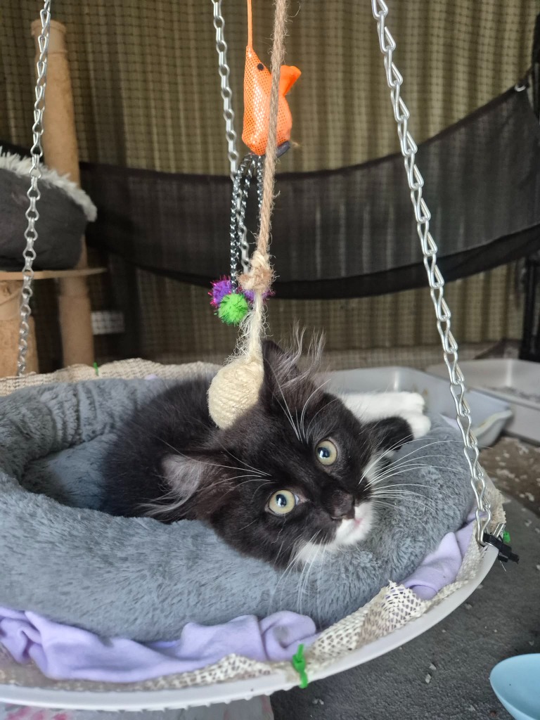 Dancer is a 12-week-old black and white kitten with a heart full of curiosity and a shy smile. One of eight kittens rescued just days before Christmas.