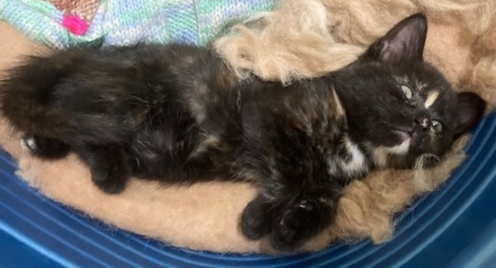 During a wet and stormy week my mum gave birth to me and my 3 siblings in a tiny space behind a garden shed. We were lucky to be found when 3 days old we were rescued by RSPCA and went to a warm, cosy foster home where we were free to grow and play together. I was the only girl and the smallest and I do sleep a lot but I certainly grew into a determined miss, holding my own in rough and tumble kitten play with my brothers. I love dangly toys and balls that roll about. Christmas was fun with lots of decorations to play with. I like my food and happily go off on my own to a quiet spot for big sleeps. I may be under a couch or on the bed! I've met the household cats but as yet no dogs. Kids are OK as long as they are gentle with me. I'm looking forward to my new home but I will be a bit shy at first, just give me time to adapt and get to know you.