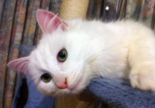 Ivy is everything you could ever want in a cat! she's calm but playful, incredibly affectionate, stunning to look at and so soft to pat. She loves nothing more than curling up on a warm lap for a snooze or a long pat. Ivy was found as a stray without a microchip and while efforts were made to find her home, no one came forward to collect her. It astounds me how someone could lose such a divine cat and not miss her enough to go looking for her. When she arrived in care, it was clear that she'd spent a bit of time on the street, and in the sun. Her ears were burnt and her claws where full of dirt. After an extensive vet check we are happy that there is no permanent damage to her ears, and while she doesn't have the best hearing of any cat i've met, she is not deaf as is common in white cats and hears well enough for it not to be an issue or concern. Ivy will only be available to a strictly indoor only home. If she were to continue to spend time outside there is little doubt that she would develop cancer. Because of her calm, quiet, nature ivy would be best suited to an adult home, or a home with teenagers rather than young children. I honestly cannot express how lucky ivy's new family will be to have such a loving, affectionate, beautiful girl in their home