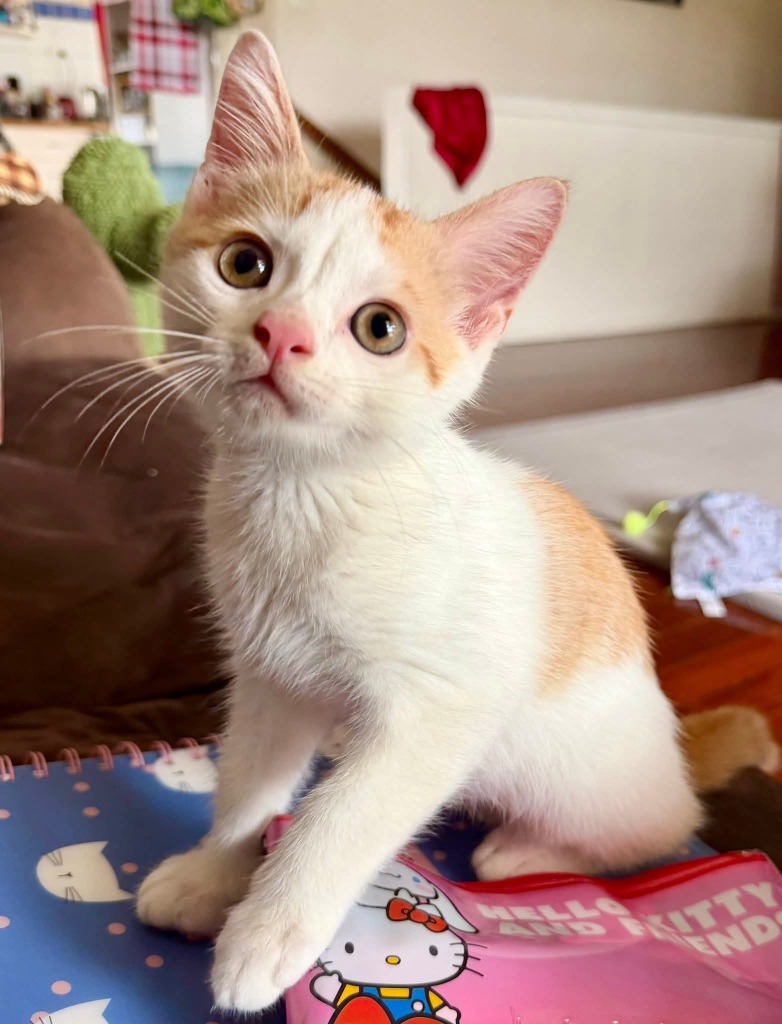 Bolt is a gorgeous ginger and white kitten with maximum orange-cat energy and a personality to match. He’s playful, curious, and always on the move — zoomies are basically his love language.