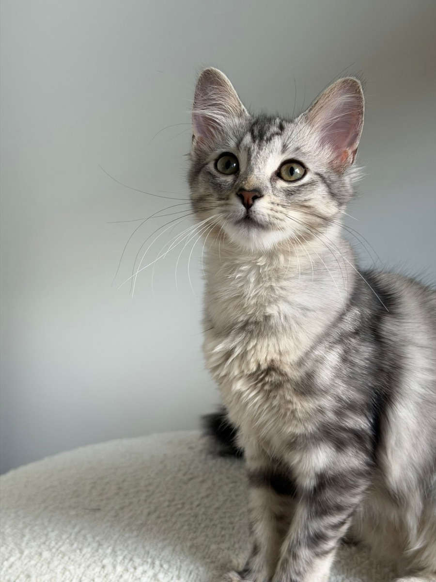 Viseria is a beautiful very soft, medium-fur kitten with the sweetest personality. She’s a little snuggle bug and a total purr factory — gentle pats or a quick cuddle are all it takes to get her motor running.