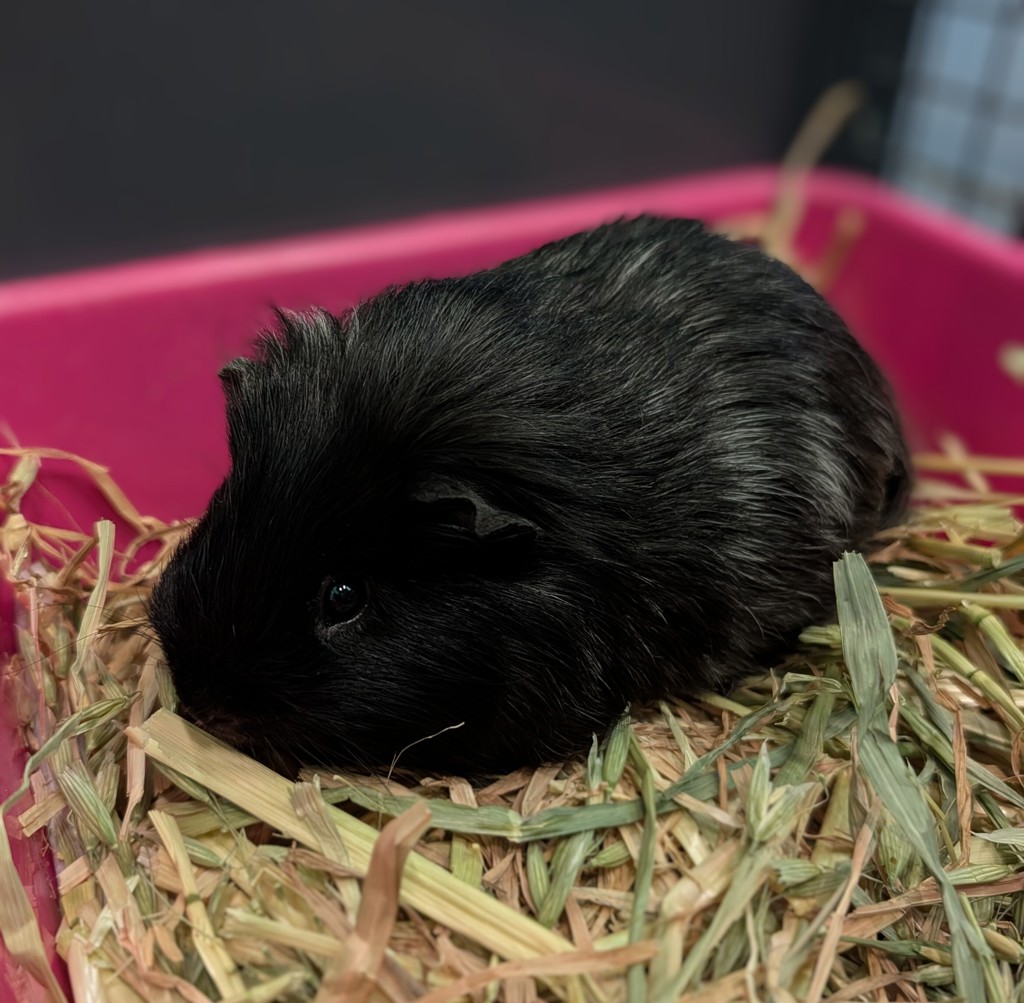 Meet Crunchy Nut! This sweet, curious young guinea pig full of personality. He is a true adventurer and loves to explore every corner of his enclosure, investigate new toys, and peek out from tunnels and hideouts with his little nose twitching! Crunchy Nut spends his days munching hay, chatting softly, and playing hide-and-seek in his tunnel. He will need gentle daily handling to help build his confidence. He may enjoy the company of another guinea pig friend pending a successful meet and greet and may to okay with calm older children.