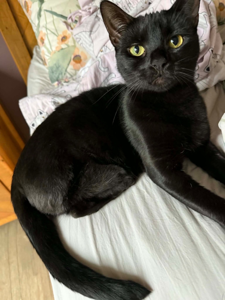 Draped in a stunning jet-black coat, Morticia is as elegant as she is full of personality. At roughly 2 years old, she’s already done her time as a devoted mum—raising her own kittens and helping care for her daughter’s babies too. Now? It’s finally her turn to be the centre of attention… exactly where she believes she belongs.