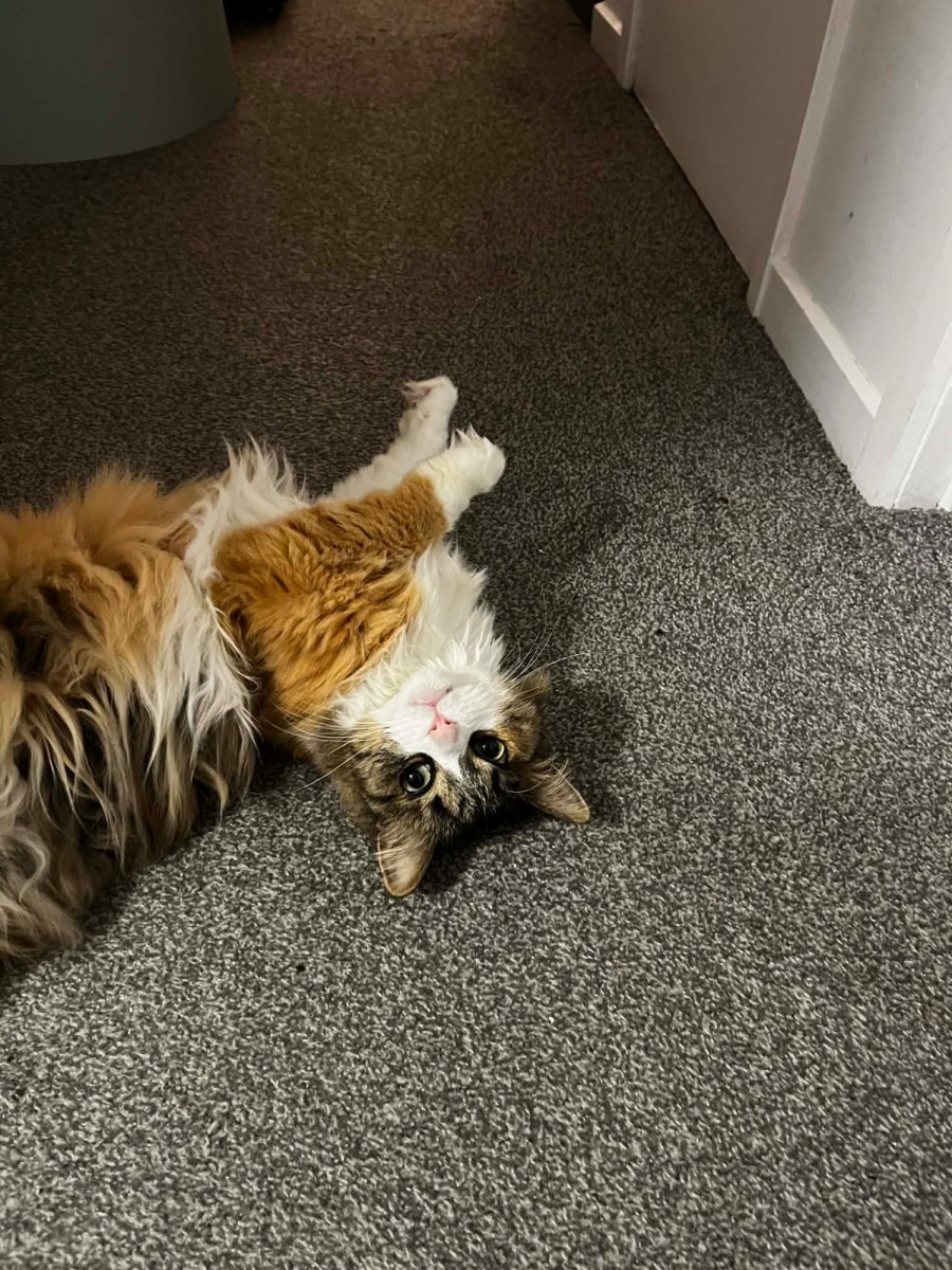 She is a very sweet natured lady who is mature, calm and loving. She is very happy cuddling up, finding a warm sunny spot inside, relaxing and giving gentle sweet little head boops and purrs.