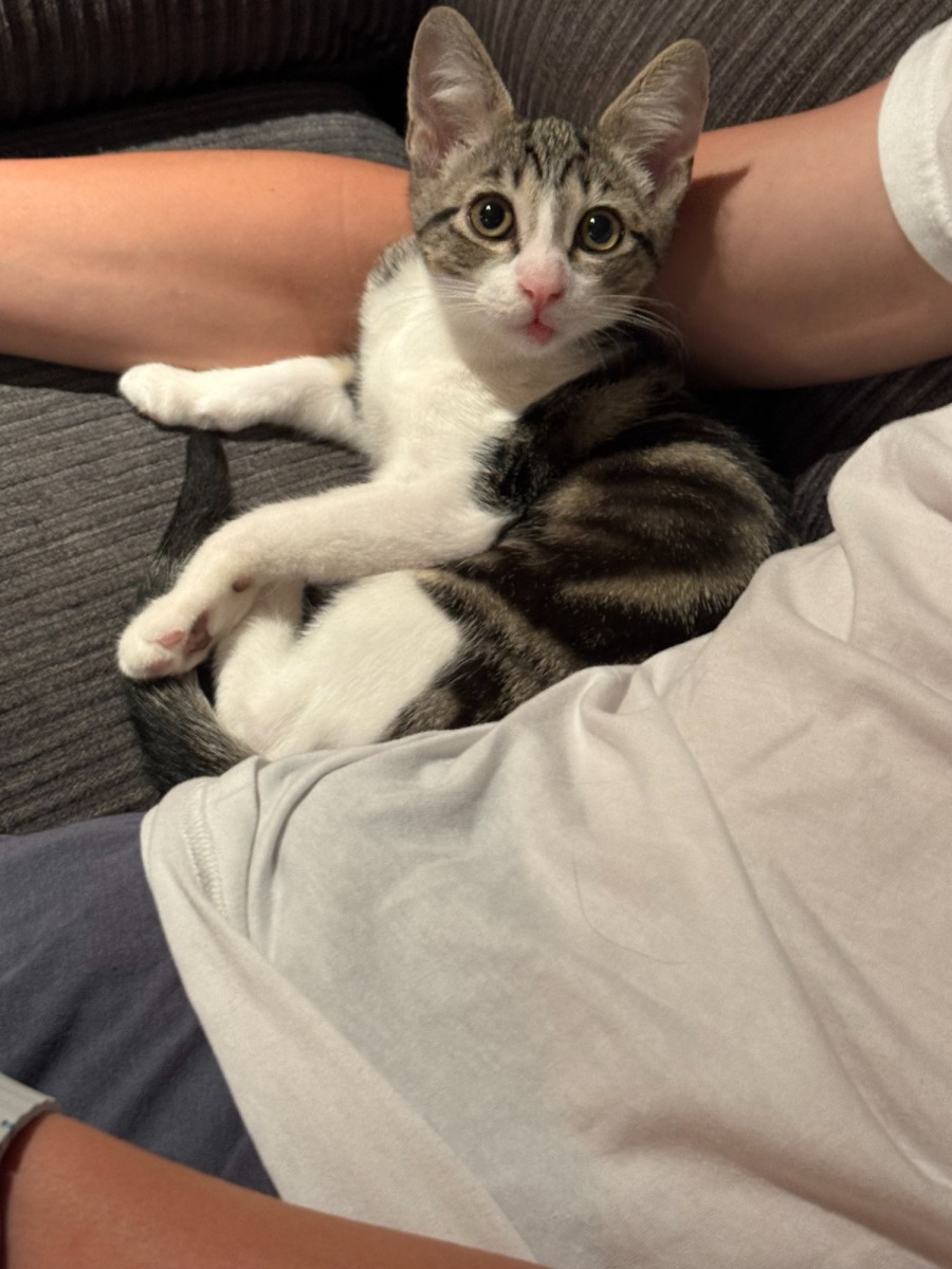 Meet Googles, the epitome of playful, cheeky charm wrapped in a cuddly kitten package. This sweet, spirited little guy is everyone's friend, displaying an endearing mix of affection and mischief. Googles loves his people and is highly sociable with fellow felines, making him the perfect choice for a family seeking an energetic, lovable companion.