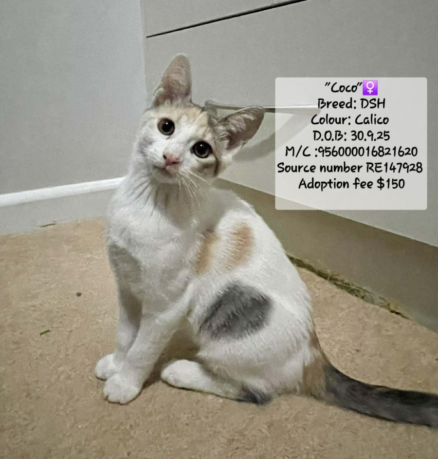 Coco is a stunning calico girl with the sweetest, softest soul to match her beautiful markings. She is the definition of gentle and easy-going, a calm, affectionate kitten who truly thrives on quiet love and kind attention. Once she feels safe, Coco is more than happy to wander over for pats, lean into a smooch, and soak up all the affection you’re willing to give.