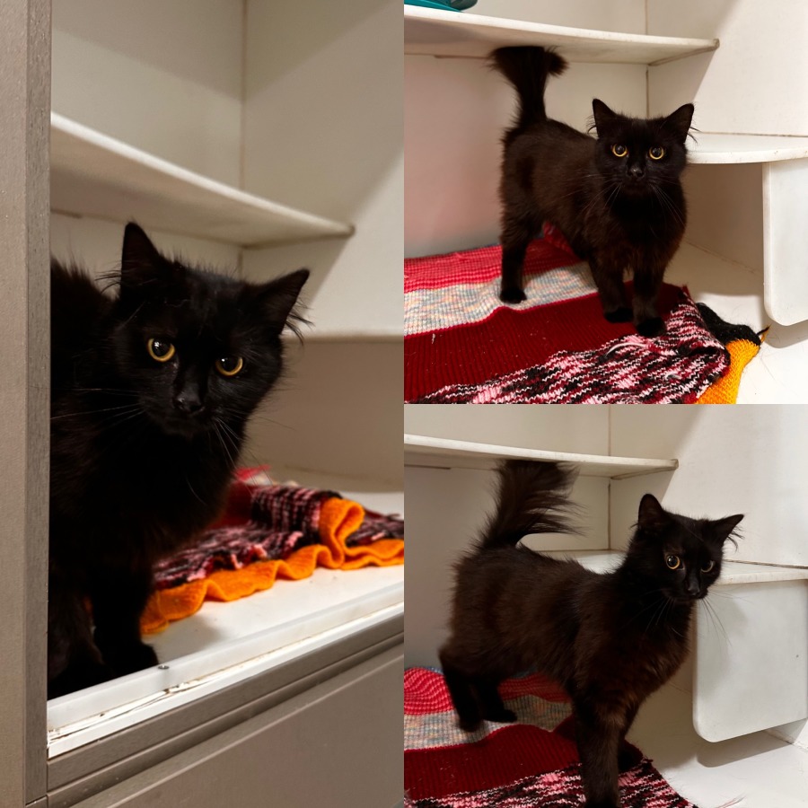 Evie is a gorgeous, petite, medium-haired black cat with the sweetest manners and a gentle soul. She arrived very shy and unsure, but with time and love she has blossomed into a quietly affectionate little lady.