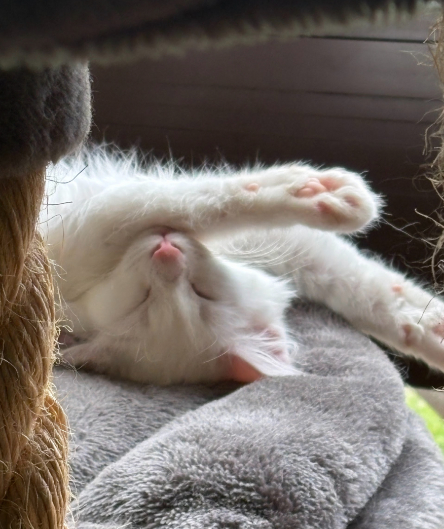 She enjoys a lovely balance of playtime and rest, and takes great pleasure in discovering all the best snuggle spots around the house for her naps.