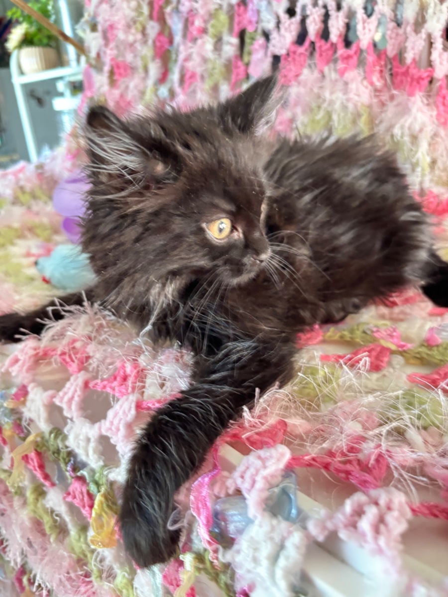 Pixie is a beautiful black fluffy kitty that will blossom into an amazing little lap cat. She is learning to love us and trust in our affection, she’s playful and will run rings around the house because she’s full of energy! She is a little shy to begin with because she didn’t been around humans before she was 6 weeks old. Her mum was an unsocialised farm cat - so she was taught to be wary of us.