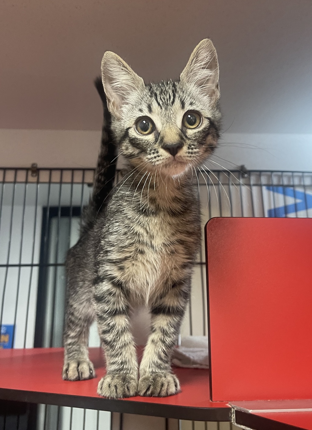 Vincent is a curious little boy with a heart full of wonder. Every day, he explores the world around him with wide-eyed fascination, learning new things and discovering. Playful and adventurous, he loves to chase shadows, pounce on toys, and practice his purrfect leaps. Despite his spirited nature, Vincent is gentle and affectionate, always ready to curl up in a cozy lap for some quiet snuggles. He thrives on attention and thrives even more in a home filled with love, patience, and encouragement. Vincent is looking for a family who will celebrate his curiosity, guide his playful energy, and share in all the little moments that make life magical. He's not just a kitten-he's a growing, learning companion eager to bring joy, laughter, and warmth to a forever home. With Vincent around, every day promises a new adventure and a new reason to smile.