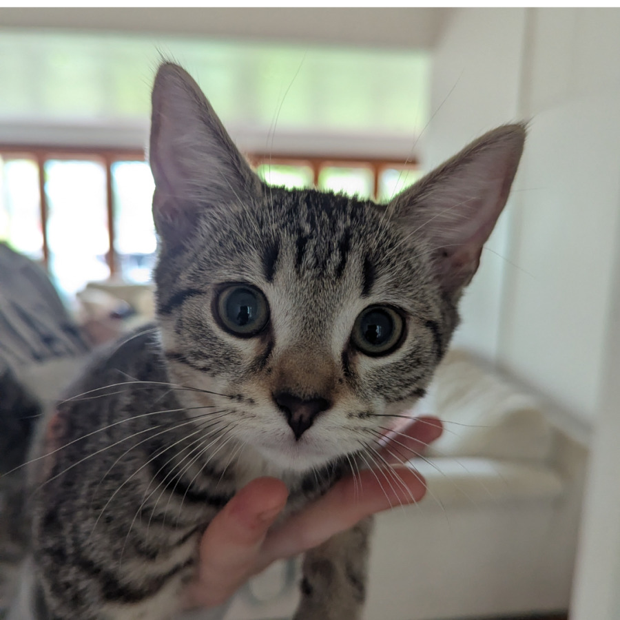 Dusty is a sweet, snuggly little boy with a huge heart and an even bigger purr. Like his brother Banjo, Dusty was born in a home and has been handled by humans since birth, making him incredibly affectionate and people-oriented.