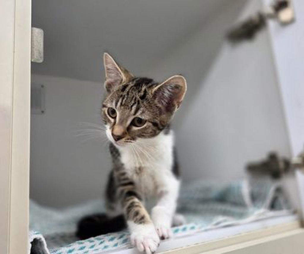 Splat is a playful, curious little kitten with a big personality packed into a tiny body. This sweet fluff loves chasing toys, exploring every corner, and then curling up for cozy naps once playtime is over. He has the loudest purr for such a small kitten and isn't shy about asking for cuddles.
