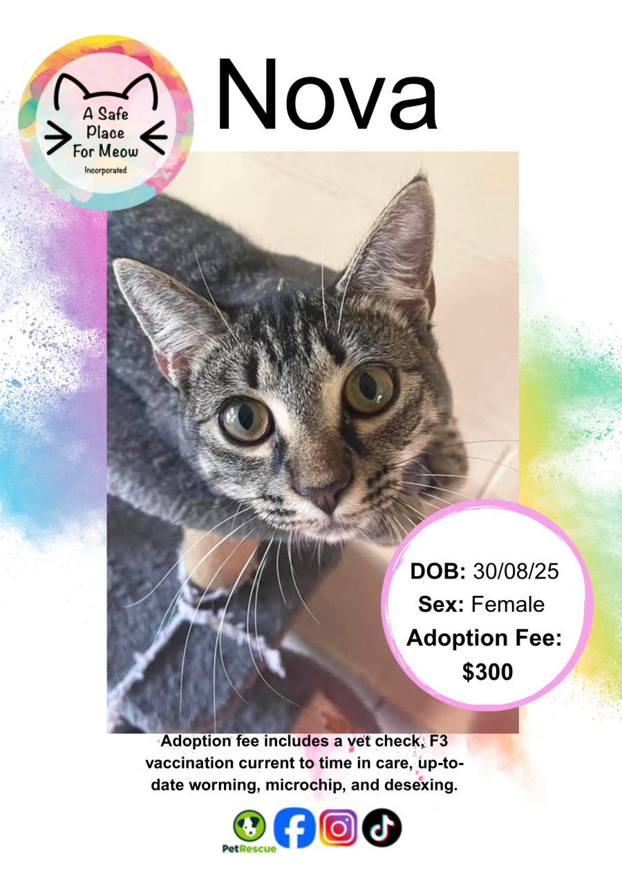 Nova, a delightful feline whose playful spirit and affectionate personality make her a joy to be around. With a twinkle in her eye, she loves to frolic and play, filling any home with laughter and warmth. Whether she's chasing a toy or partaking in a spirited game of hide-and-seek, Nova's zest for life is contagious.