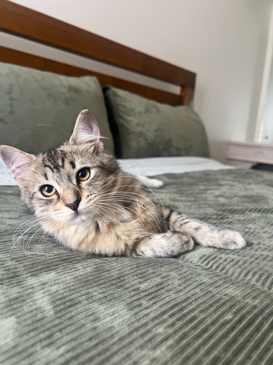 Flo is a confident, brave, and easy going kitten who is completely unfazed by the hustle and bustle of a busy home. Vacuum cleaners? No problem. Barking dogs? Doesn't bother her! 🐶🚫 She plays hard, exploring every corner of the house and climbing to the very top of her cat tower, but she crashes even harder. 💤 When it’s nap time, there is nowhere she’d rather be than curled up in your lap or tucked into your side for a long snooze. 🛌✨