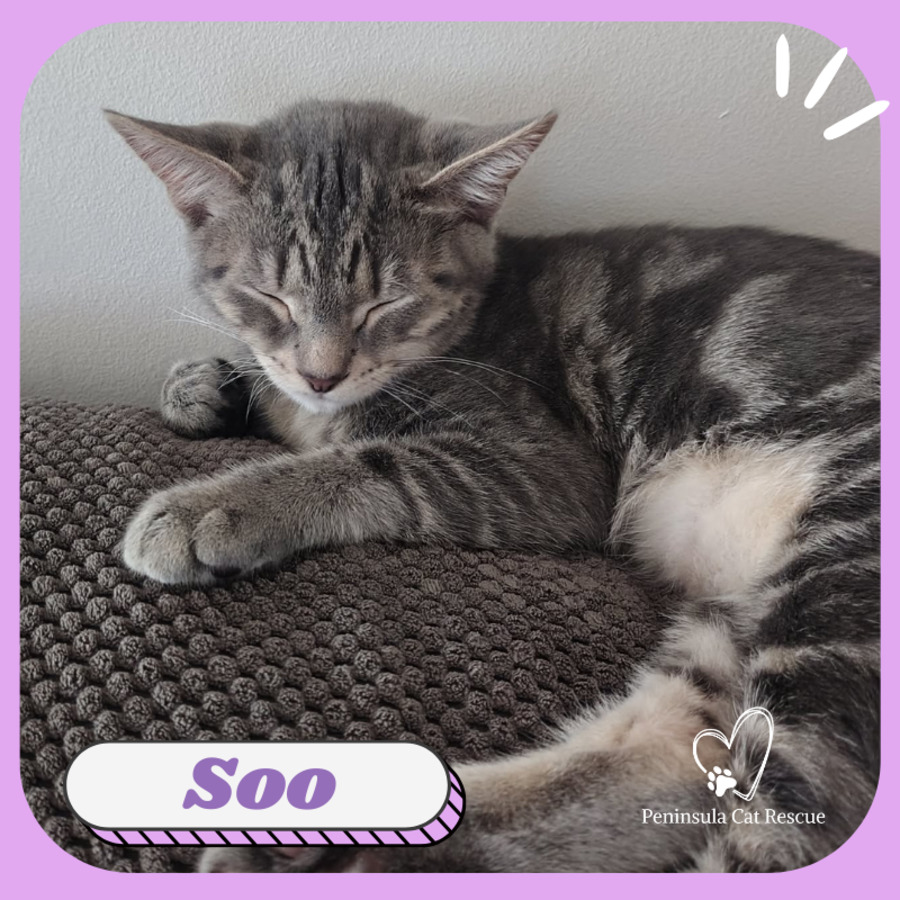 Soo is a beautiful silver tabby kitten with a confident, spirited charm and a delightful dash of sass. She knows who she is and carries herself with confidence, bringing plenty of personality and fun to those around her.