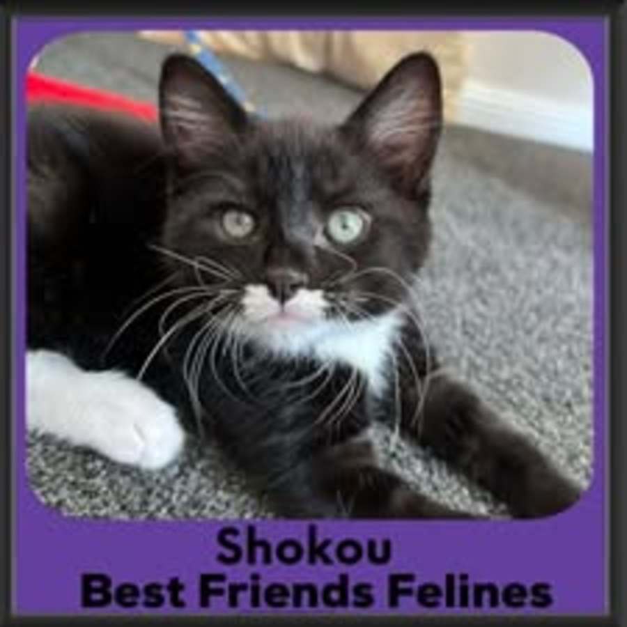 Shokou is a confident petite little girl with a super soft beautiful coat which is mostly black with some white. She is very inquisitive and loves to explore. Shokou is loving and likes to snuggle. She purrs happily when petted and likes a lap to sit on. Shokou has a gentle nature and would suit a home where she can explore and get lots of attention.