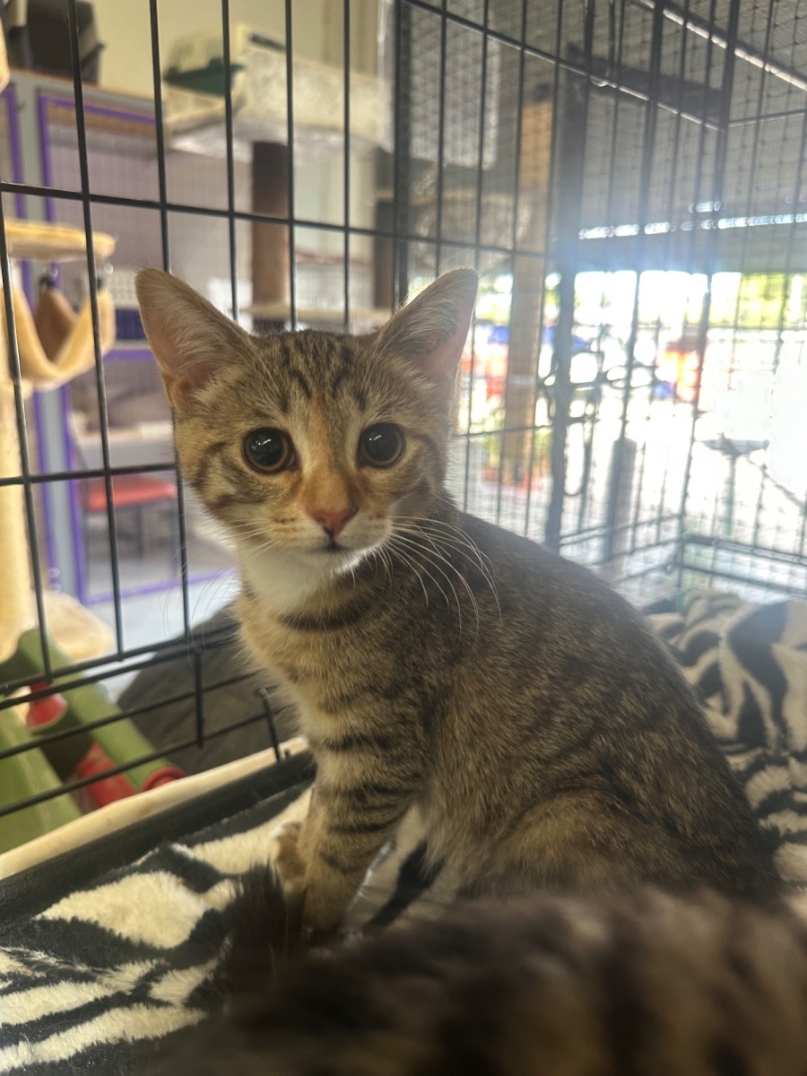 Old female desexed kitten - hand raised in a foster home . She is a confident little kitten who has been around other cats in her foster home also .