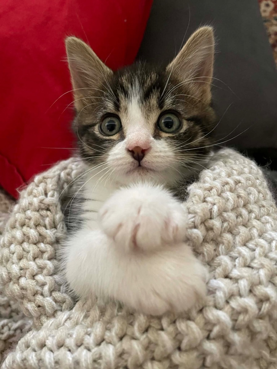 Meet Fruit Cake, an irresistible 8-week-old Tabby & White Domestic Short Hair kitten with a personality as delightful as her name. From the moment you meet her, you'll be enchanted by her playful spirit and her adorable antics as she zooms around the house with energy and charm.