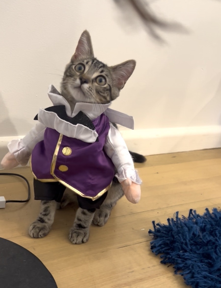 Meet Truffles, a charming tiger tabby with a magnificently swirly coat that sets him apart. His adorable looks are matched by an engaging and confident personality that makes him an instant hit with everyone he meets. He loves to chat. With a sense of playfulness and assurance, Truffles is great with kids and brings an element of excitement to every day. Yes, the kids did dress him up. No, it's not AI. Did he enjoy it? Hmmmm.... tolerated it and enjoyed the attention. Quite enjoyed running around in his costume looking very debonair!