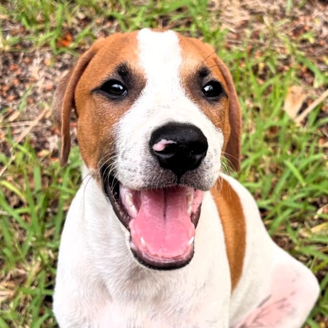 Nash is a playful, affectionate tan-and-white boy with the cutest markings, a big spot on his back and rich brown around his ears that meet in the middle with a sweet little spot. He’s eager to learn, loves to play, and enjoys socialising, especially when cuddles are part of the deal. Nash has already mastered sit and paw, is very good off lead, and while he can’t resist saying hello to other dogs and people, his enthusiasm comes from a happy, curious heart.