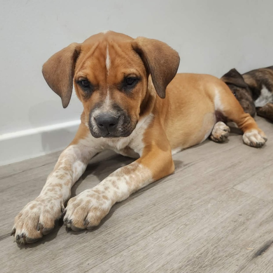 Their mum, Mia, is a mastiff x staffy and a lovely medium-sized dog with a gentle, people-loving nature. Some of the pups have natural stumpy tails, so we believe their dad was likely a stumpy tail cattle dog. Based on this, the pups are expected to grow into medium-sized dogs who will enjoy being active, engaged family companions.