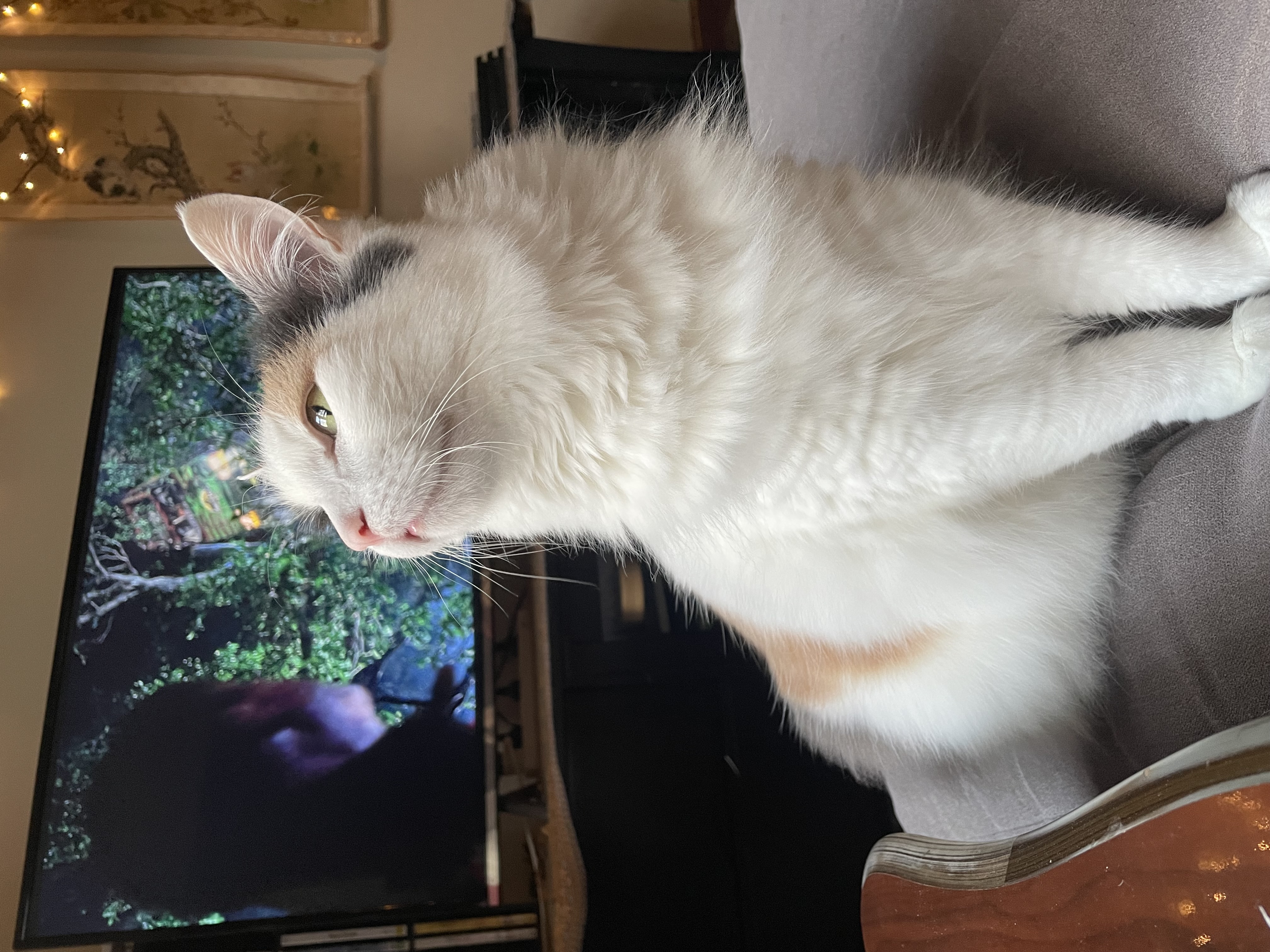 She’s affectionate in her own stylish way, often rolling around just out of reach to show off her impressive tummy fluff until someone comes over for pats and chin scratches.