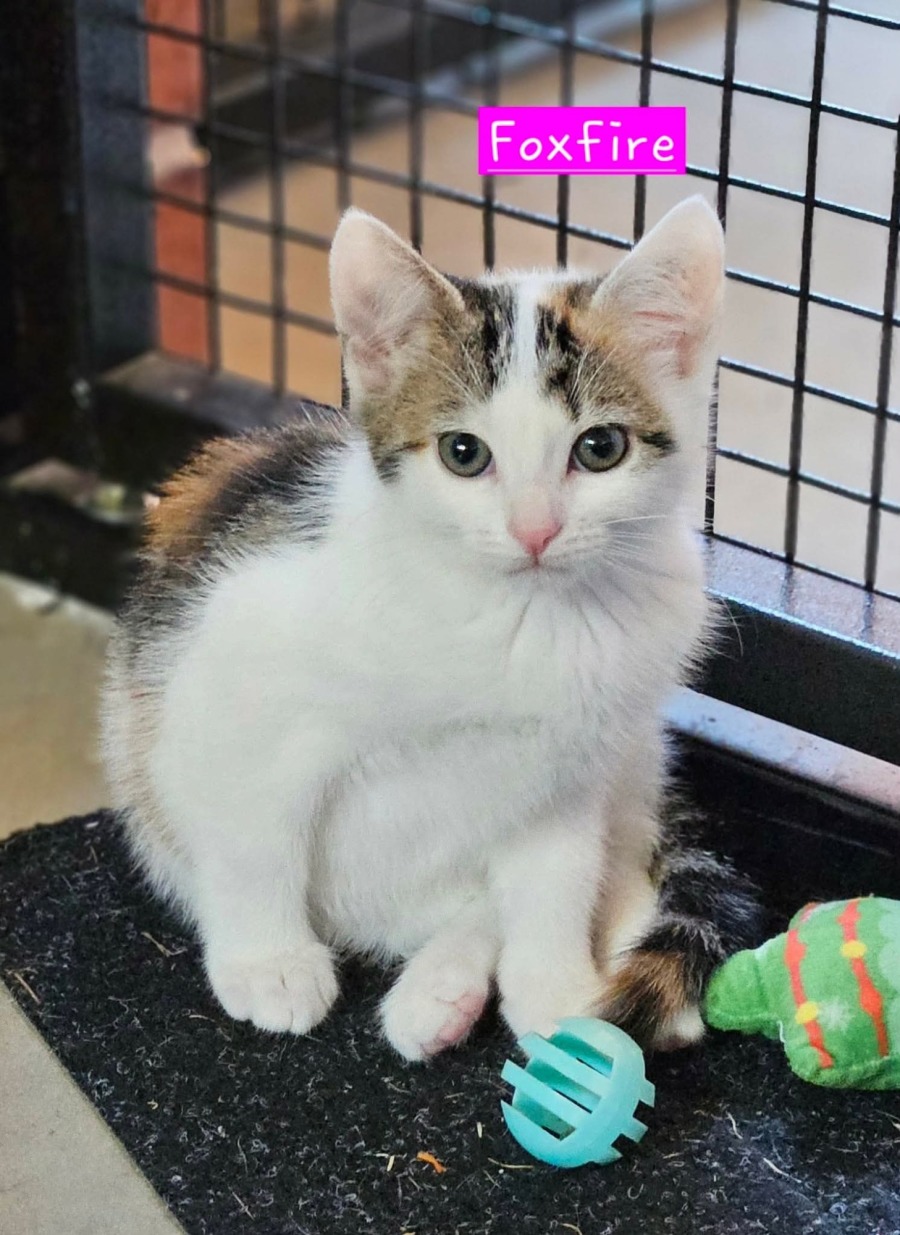 Foxfire is a calico domestic short hair kitten that is now 11 weeks old (estimated date of birth 28/10/2025). Foxfire came into our care with her littermates and mum from a rural pound.