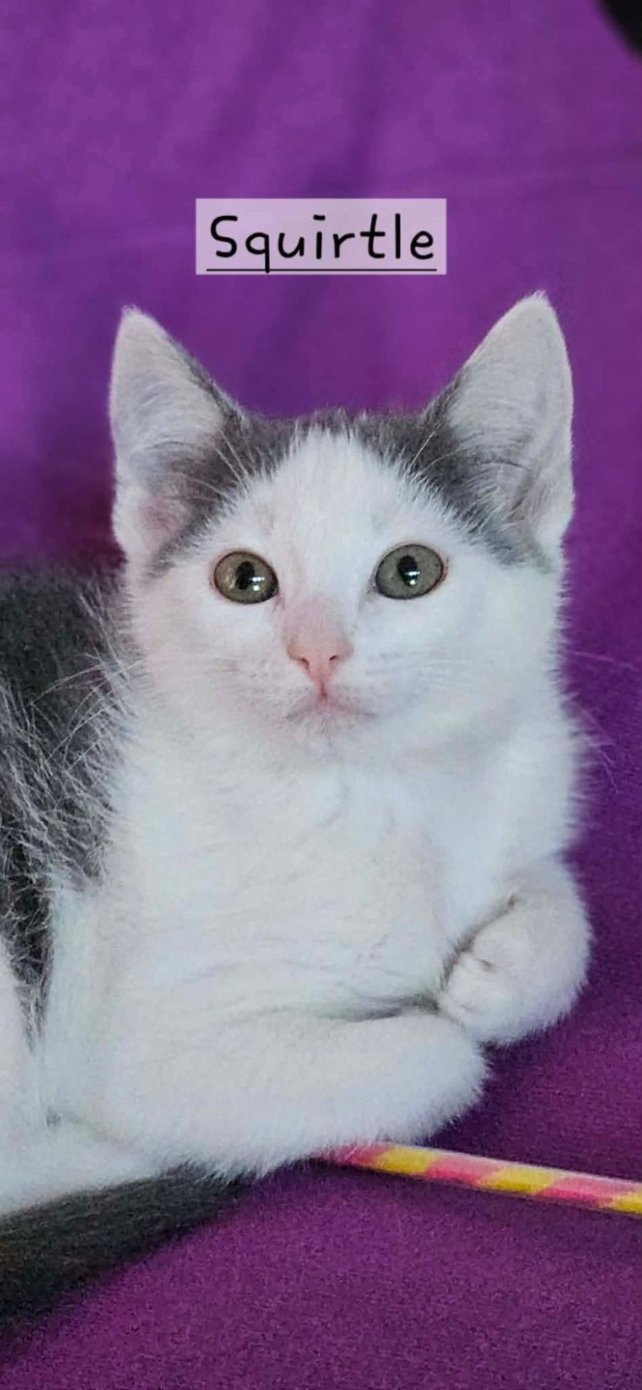 Squirtle is a white and grey domestic short hair kitten that is now 11 weeks old (estimated date of birth 28/10/2025). Squirtle came into our care with her littermates and mum from a rural pound.