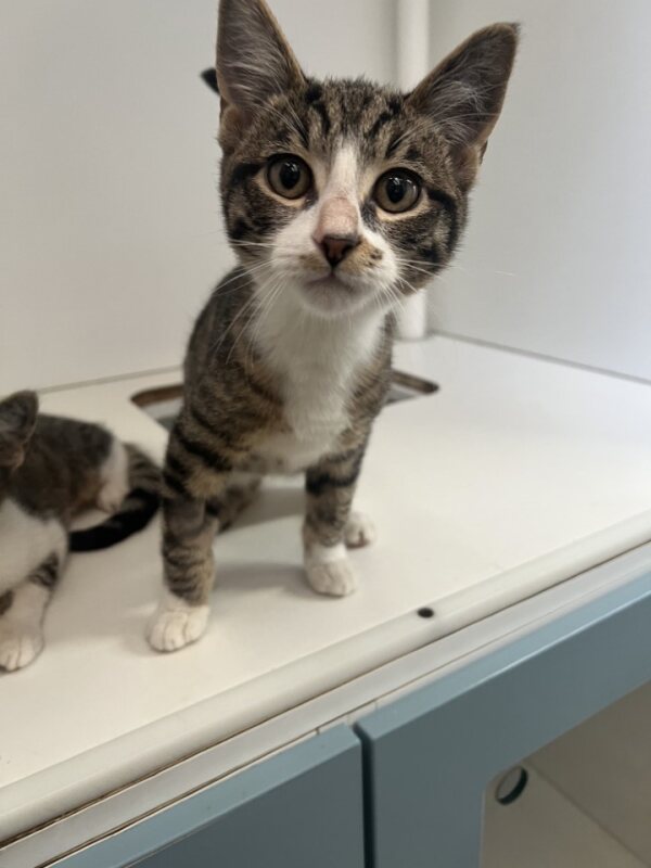 Bram is a handsome tabby-and-white kitten with a confident, gentle nature that makes him a wonderful companion for a new cat owner. He approaches the world with curiosity and calm assurance, happily exploring his surroundings while also seeking affection from the people around him. Bram is a sweet-natured kitten who enjoys attention and will gladly settle in for cuddles once playtime is over. He gets along well with other cats and would thrive in a home with feline company, but he would also be perfectly content as the only cat. With his friendly personality and easygoing confidence, Bram might just be the perfect addition to your home.