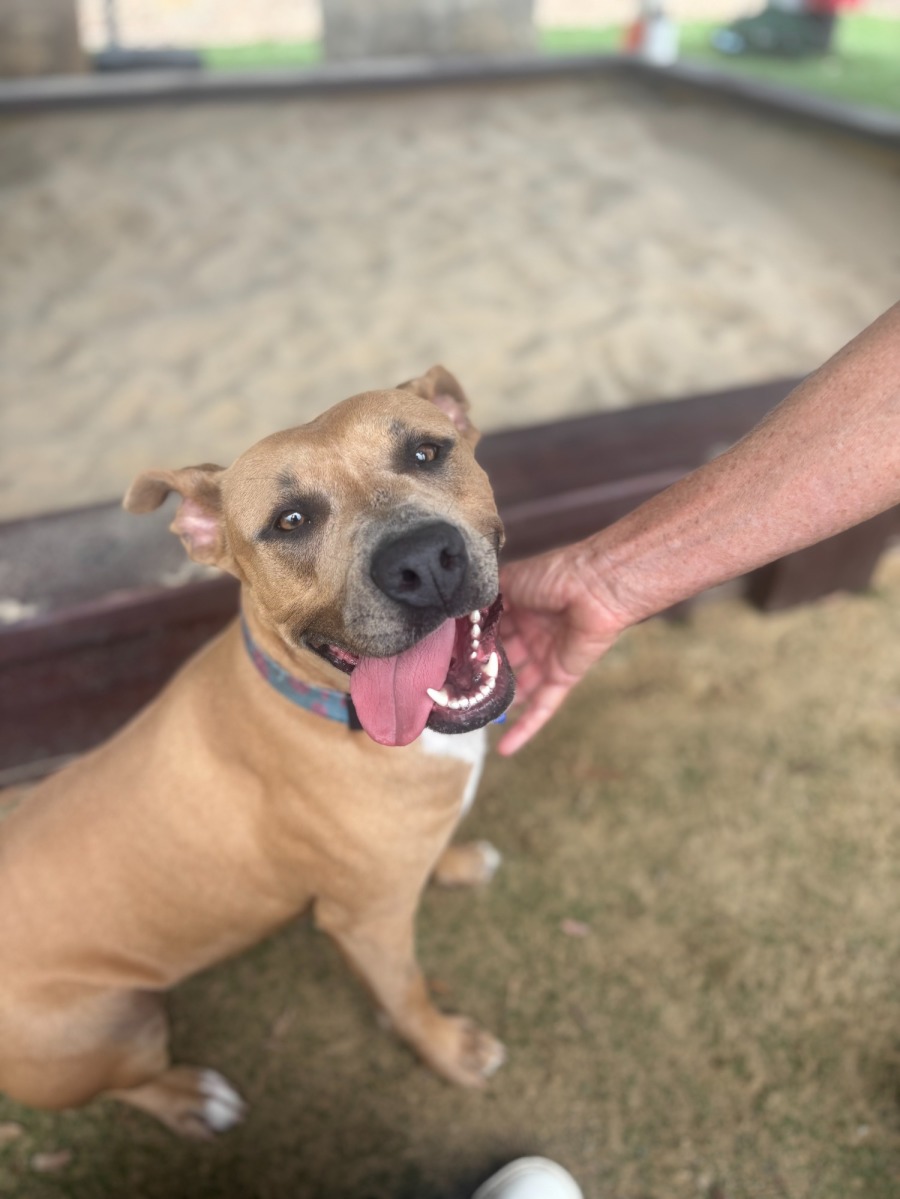 A little smaller than she looks, Milly stands around knee height - but has the classic bulkiness of a staffy. With ears like a kangaroo, gentle eyes and the softest fur - Milly will be sure to charm her way into any household.