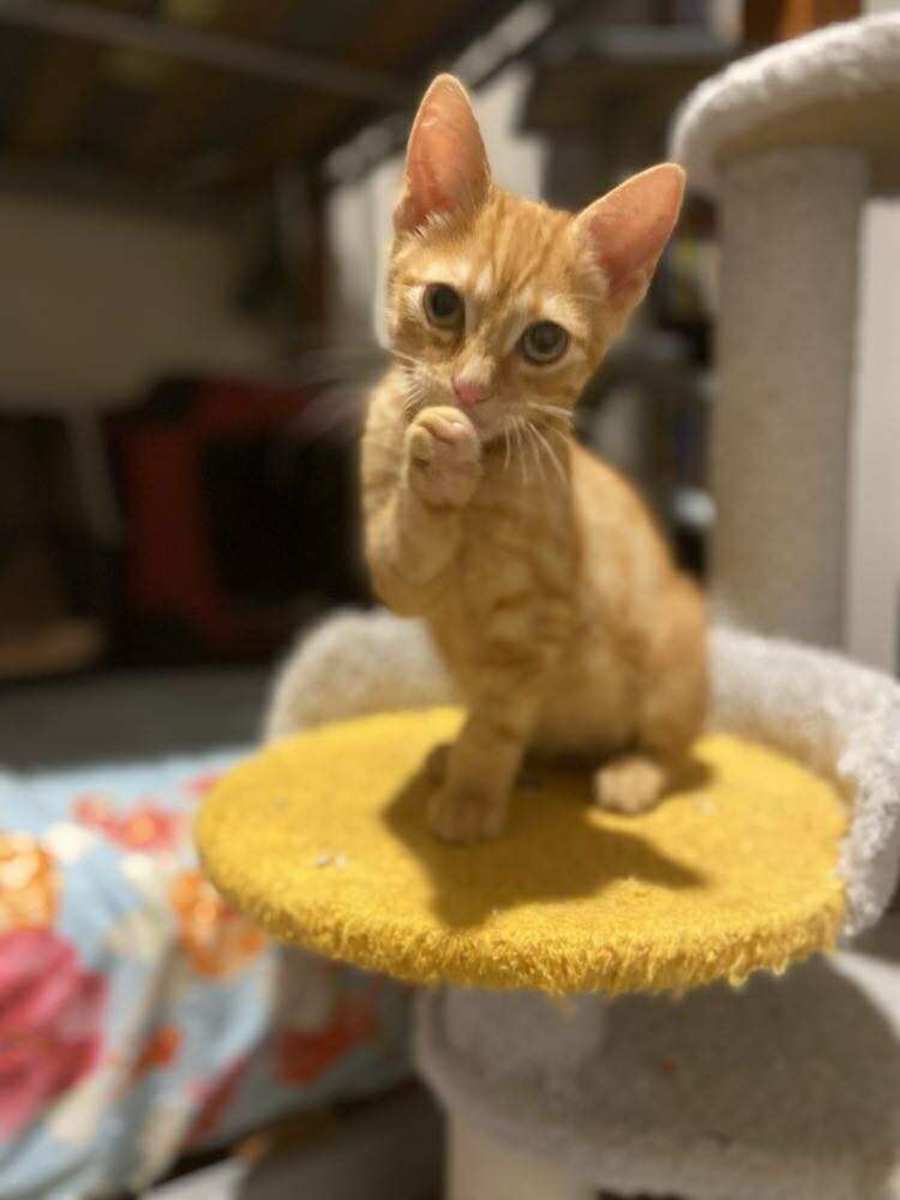 Meet Marty, a charming ginger ninja with the acrobatic flair of a circus performer! This delightful little comedian will keep you entertained with his antics and bring a smile to your face with every leap and bound. With his large, endearing eyes, Marty is always on the lookout for his favorite person, and when he finds you, he dedicates himself wholeheartedly.