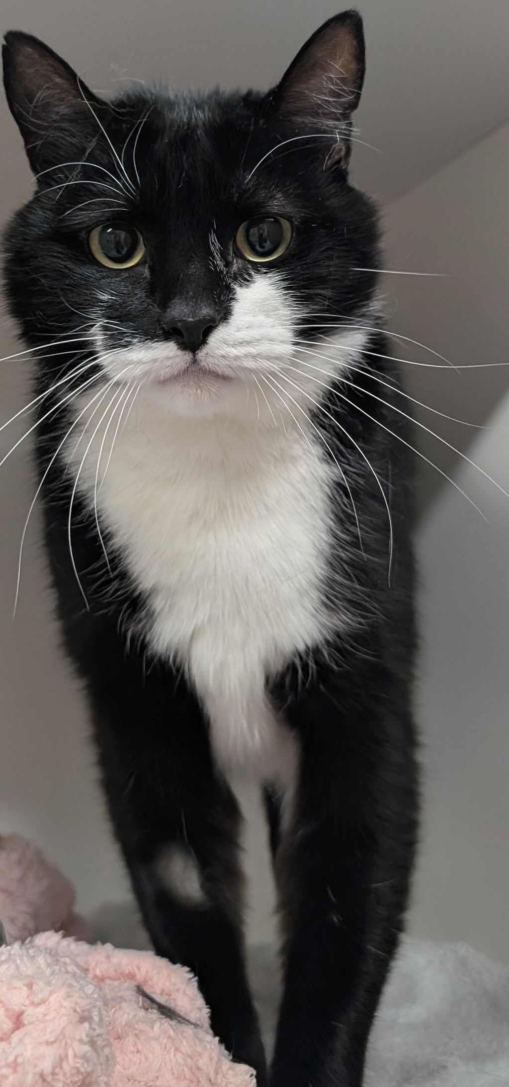 Kiwi is a sweet 5-year-old female cat with a striking black and white coat. She absolutely adores head scratches and cuddles, and she'll happily keep you company wherever you go. While Kiwi is friendly and affectionate, she can be a little sensitive to loud noises, so she would thrive in a calm, loving home where she can feel safe and relaxed.