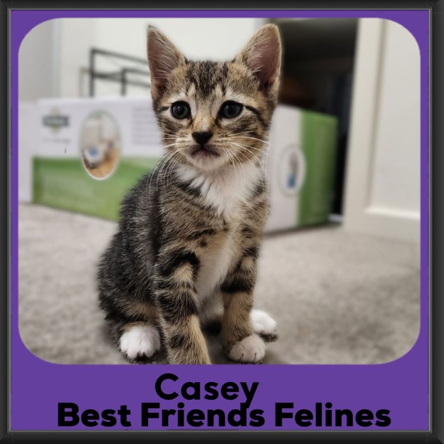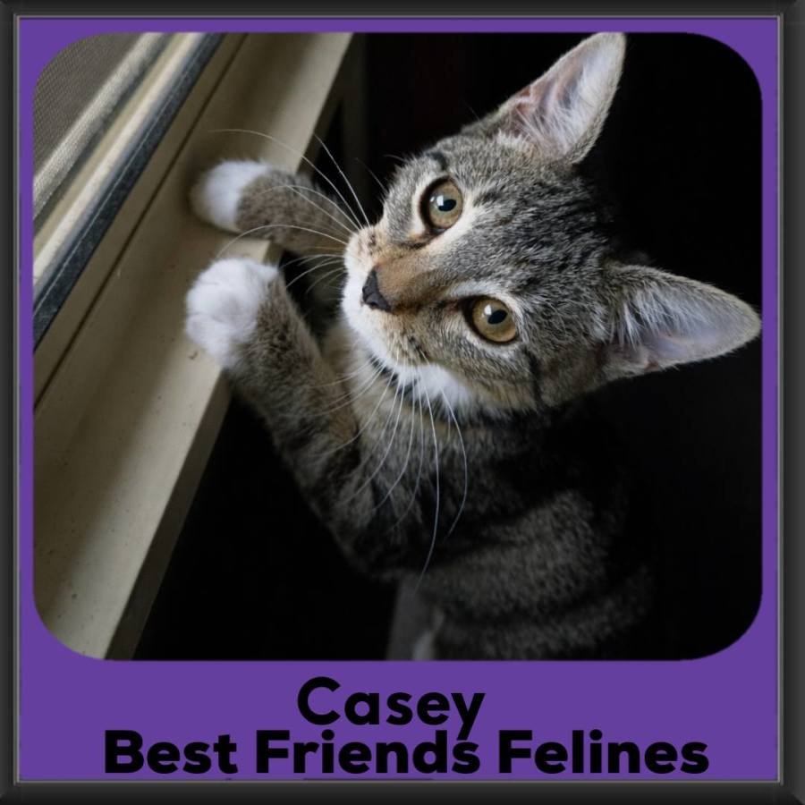 While she might be a bit cautious at first when it comes to meeting new people, she warms up quickly with the lure of a treat or a dangly toy. Once she’s comfortable, she’ll start to show her softer side. Casey would do best in a home that can offer her lots of affection and playtime, ideally with another patient cat to keep her company (and keep her entertained!)
