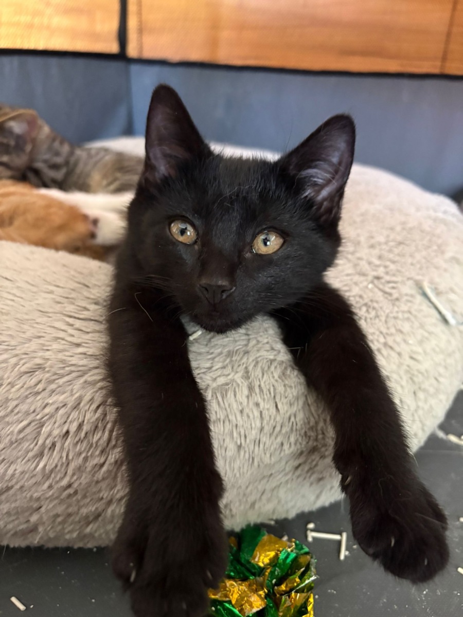 Jarrah is a gorgeous black kitten with a calm, cuddly nature and a playful side he loves to show off. He enjoys a good play session with his toys and is just as happy to settle in close for pats and snuggles afterward.