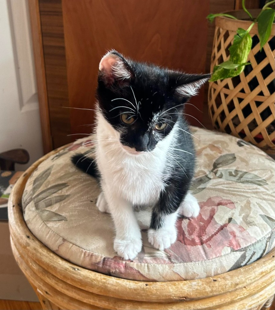 He is very cat social and must be adopted to a home with an existing cat or be adopted with his equally as adorable sibling Thorn. Kittens do much better with a cat friend, it is worth research "solo kitten syndrome" to find out why. Moss also loves his dog sister and would suit a home with both a cat and dog companion 😺