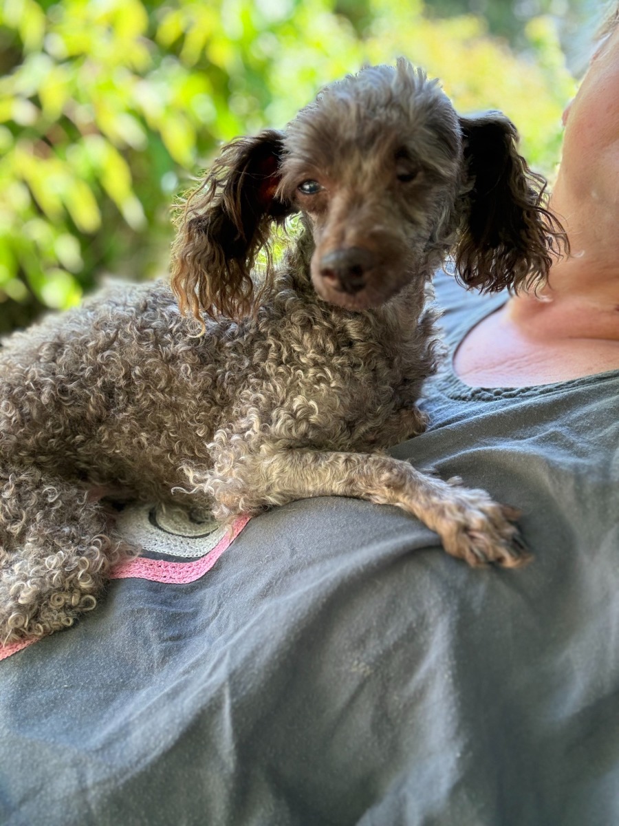 This precious little lady is a female Toy Poodle with a gentle soul and a heart full of love. She is very timid and shy at first, especially in new environments, but once she feels safe, her true personality shines through. She only has one eye but it works well!
