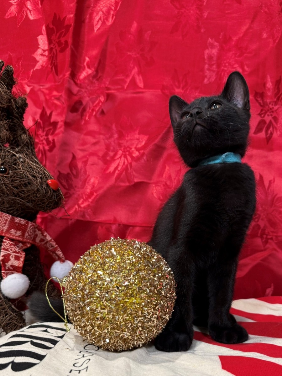 Blitzen is a sleek, shiny black boy with a personality that lights up the room. The moment you touch him, he switches on his insta‑purr - loud, happy, and completely irresistible. Give him a good pat down his back and he’ll lift his bum high in the air, tail waving like a little flag of joy.