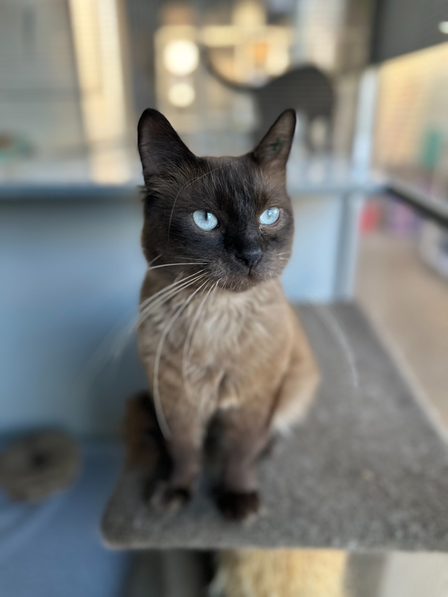 With his big, bright eyes, Baxter likes to keep tabs on everything happening around him. He is an observant boy who enjoys watching the comings and goings of the cattery, paying particular attention to the outside dog called Kitty. He is definitely on alert when she is around, watching her and retreating into a cat tower when she gets to close to window. When it’s time for affection, he’s all in chin scritches and big pats are his absolute favourites, and he gazes up at you with pure adoration as you oblige. He does have a limit of how many he likes and will let you know when he has had his fill.