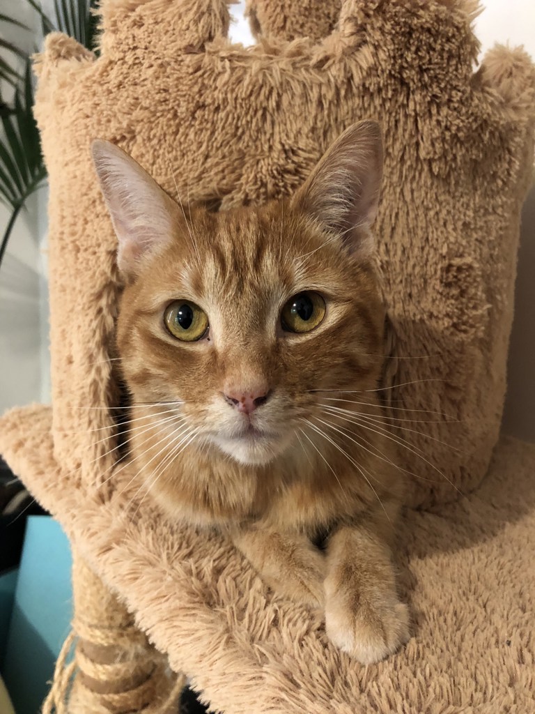 Simba is an active and affectionate cat with loads of personality! He's playful, LOVES to climb, and even know a few tricks like 'sit' and 'spin'- he would love to learn more! He's a bit of a night owl and enjoys his zoomies, but also loves naps, cuddling with his humans, and lounging in his window hammock. He's a people-social cat who likes to be nearby and have a chat. He would love a household with plenty of toys, places to perch, and a routine to help keep him settled.