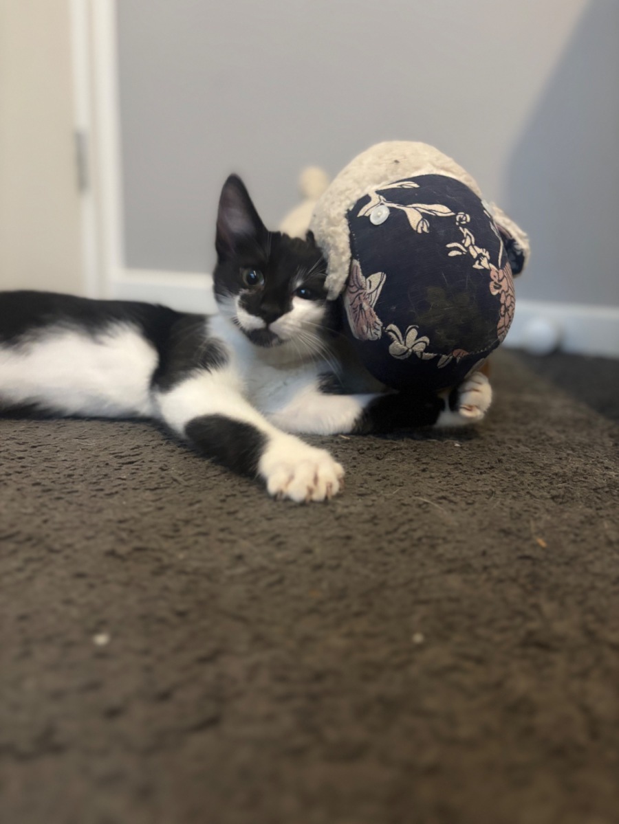 But don’t let the tough-guy act fool you. After a long day of protecting the household and conquering his toy collection, James Bean turns into a professional cuddle bug. He melts into warm laps, tucks his little tuxedo paws under his chest, and purrs like he’s humming a love song.