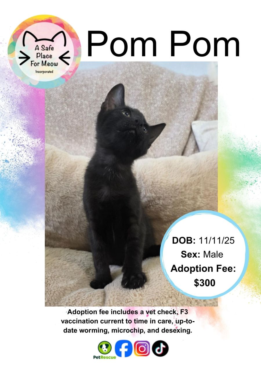 Pom Pom is a gorgeous black boy with a shiny coat and a loving heart 🖤🐈 He’s a happy, playful kitten who loves a good game just as much as he loves a cuddle 💤💞 Whether he’s bouncing around with his siblings or purring in your arms, Pom Pom is always content and relaxed.