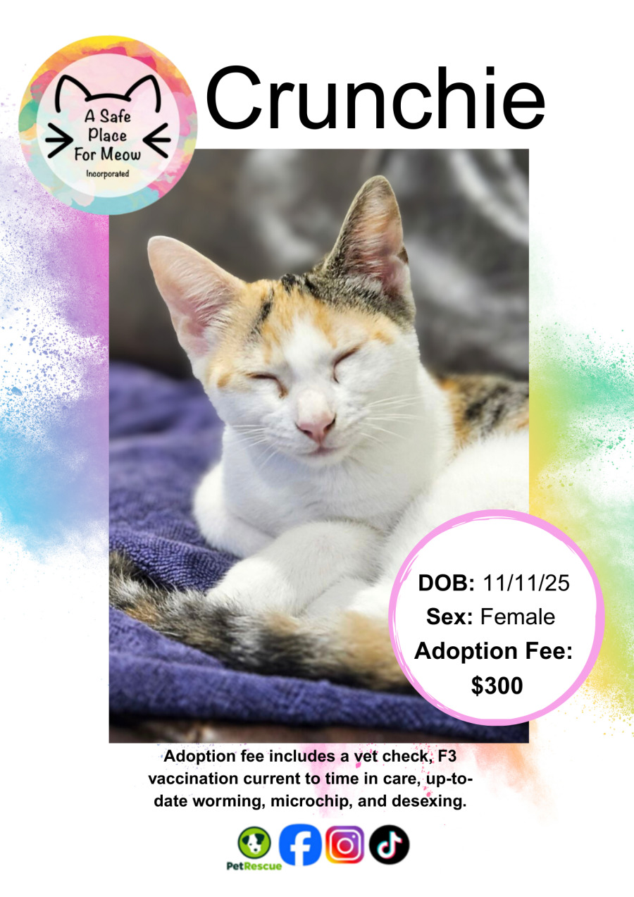 Crunchie is a stunning calico girl with a big personality packed into a tiny body. She’s playful, cheeky, and always the first to bounce into action when it’s time to play This happy little girl adores chasing toys, wrestling with her siblings, and investigating anything new and exciting.
