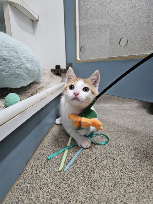 Hey there, I'm Benedict Cumbercat. I’m a friendly and affectionate kitten who would suit most homes! My playful paws are always ready to pounce on anything that moves. I love playing with wand toys and mysterious shadows on the wall! When I’m finished playing, I love nothing more than finding a warm lap to curl up in. I have perfected the art of the irresistible purr. It's like my secret weapon for getting all the cuddles and chin scratches I could ever want. Life's just one big, exciting string of moments, and I'm here to make every second count – whether I'm chasing my tail or sharing some purr-fectly quiet time with my favourite humans. So, if you're up for a bundle of furry fun and a lifetime of companionship, please consider adopting me!