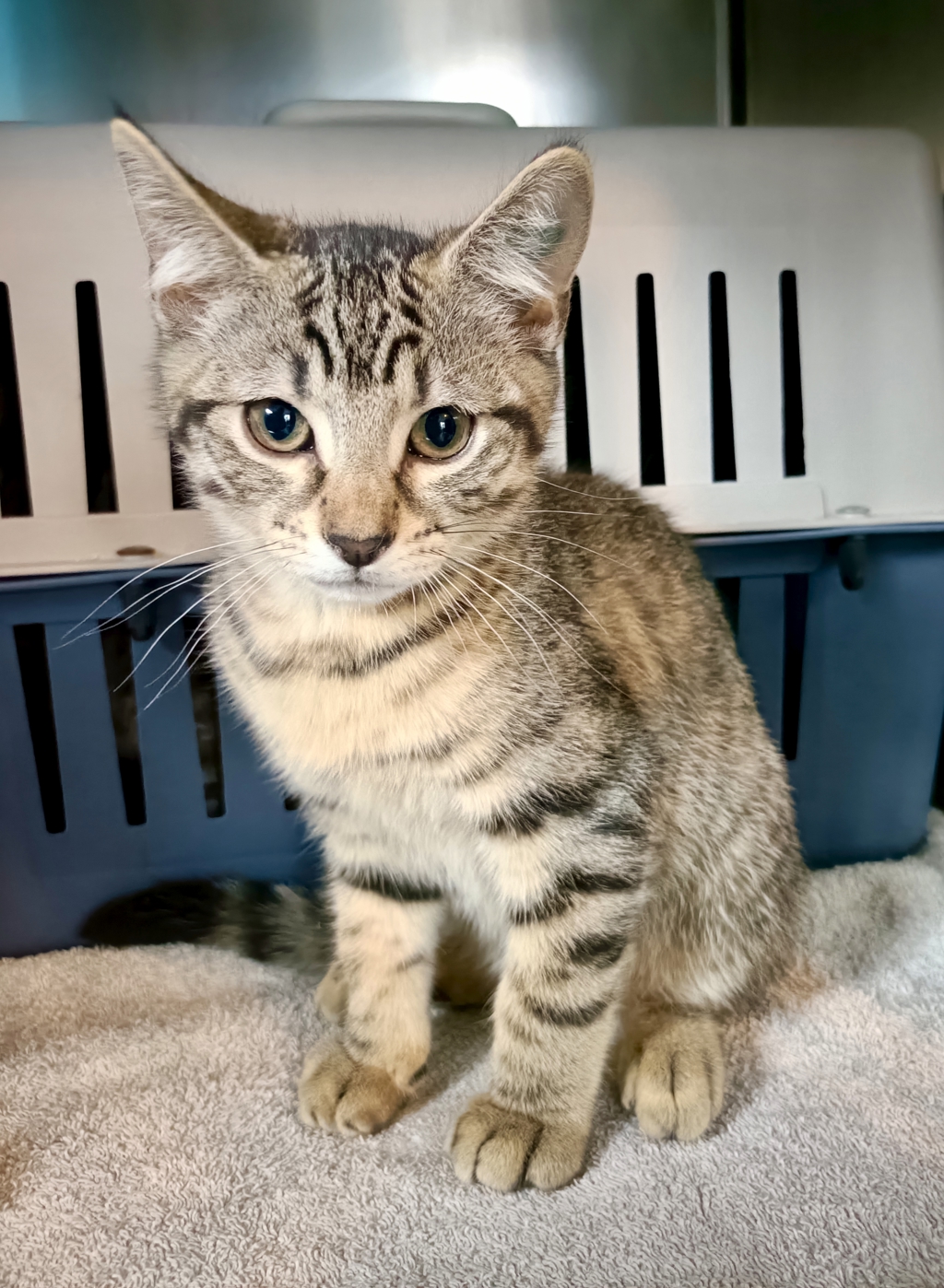 Dylan is a handsome male tabby shorthair kitten with a confident, playful personality. He loves to be right in the middle of the action and is always ready for a game, whether it's chasing toys or romping around with his kitten friends. His outgoing nature and happy energy make him a joy to be around.