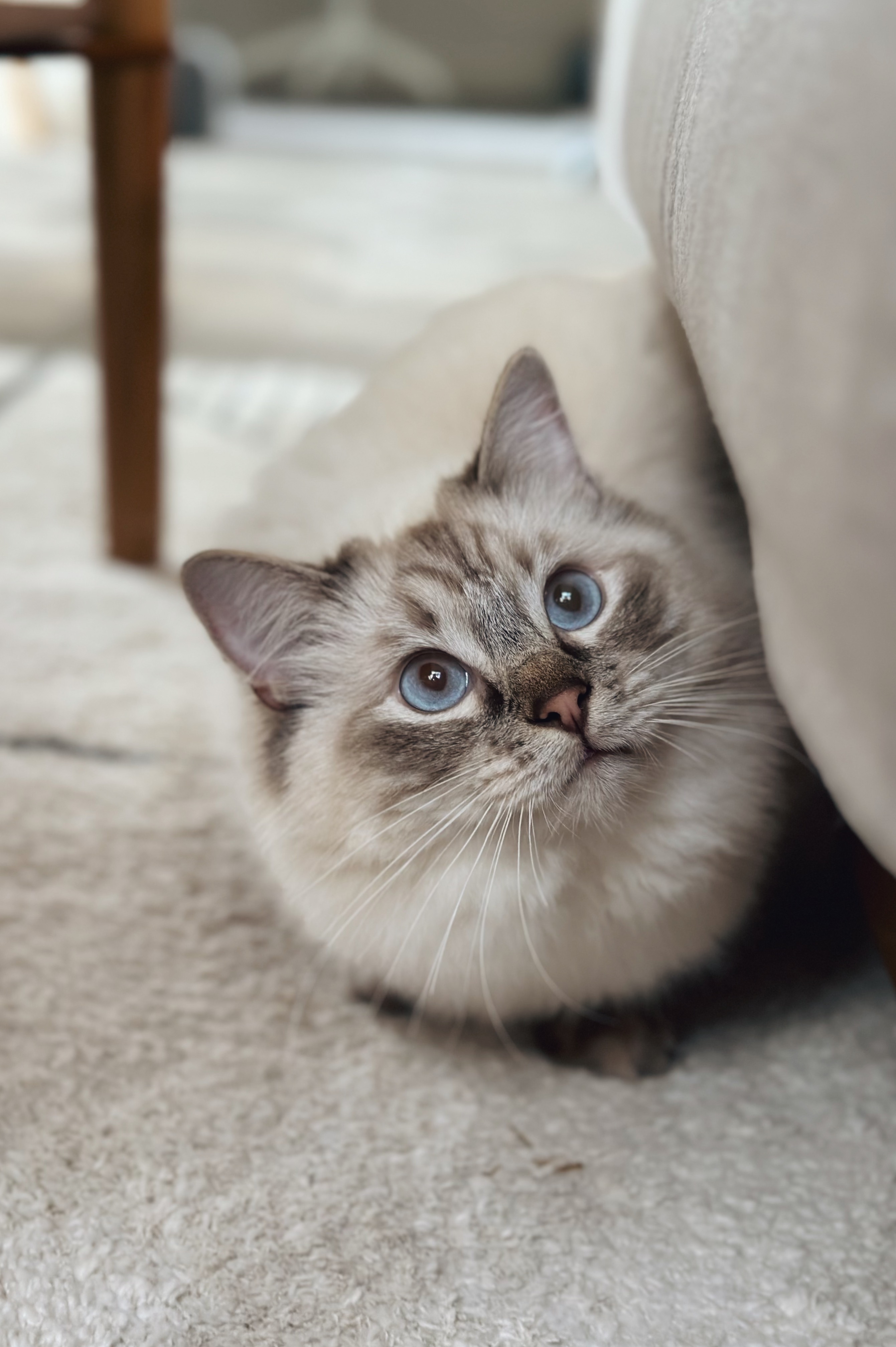 His joys are simple and delightful—chicken breast snacks, bouncy ball toys, and legendary armpit scratches rank very highly. His days start with a punctual 7am breakfast, followed by window watching, chatting, and a post-meal nap. After a midday feed and more bird surveillance, evenings are reserved for playtime, treats, couch cuddles, and a tidy bedtime around 10:30pm. One of his most charming habits is his morning wake-up routine, where he rolls around, chats to you, and politely demands scratches.