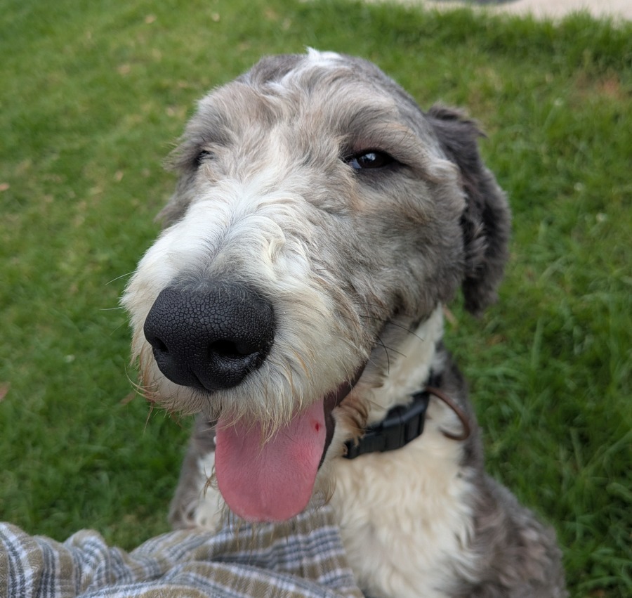 Since he still has some growing to do, he will be quite tall once fully grown and his curly oodle-like coat will need regular grooming to keep under control.